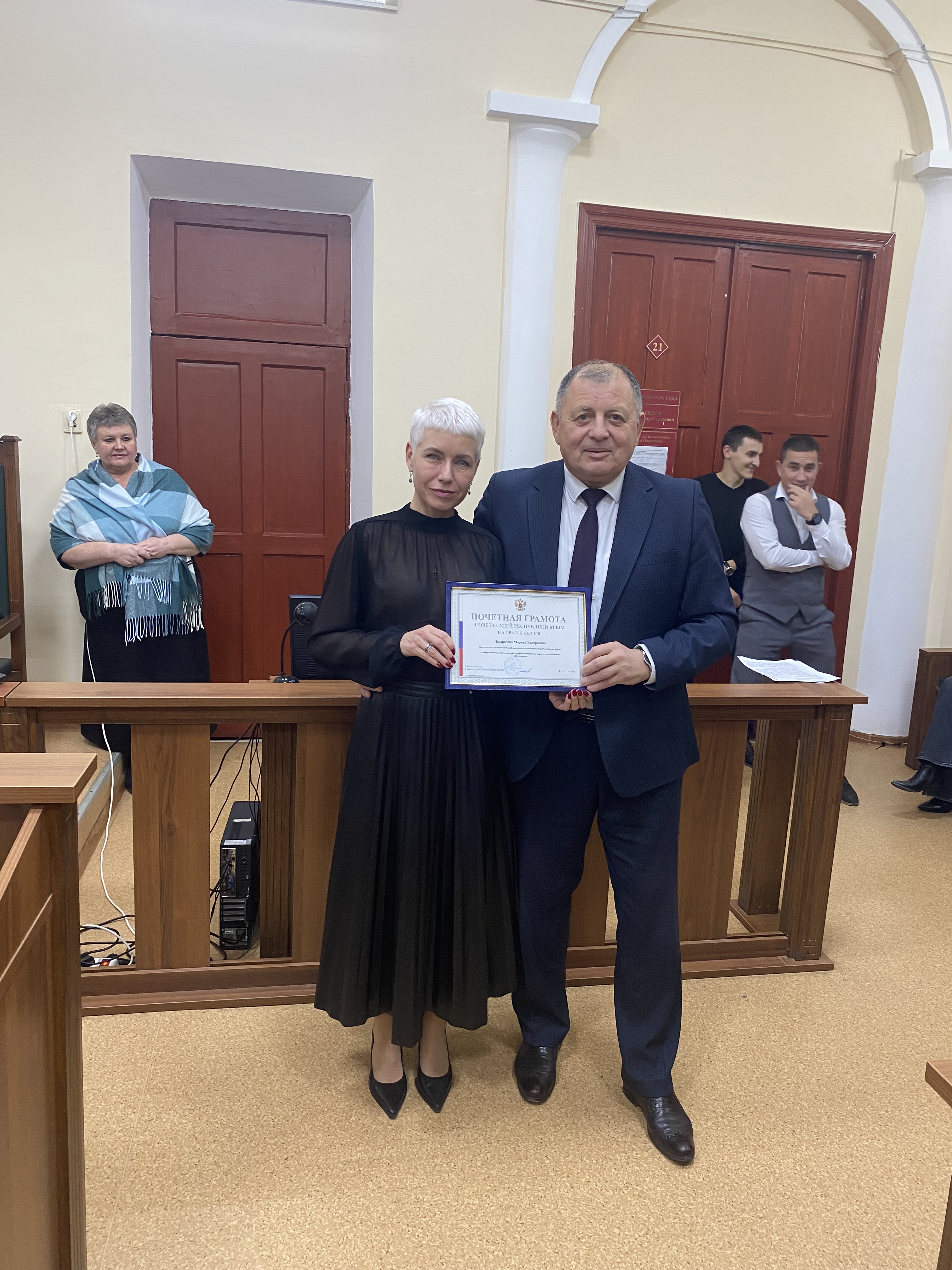 Почётную грамоту Марине Валерьевне вручил председатель Симферопольского районного суда Республики Крым Сердюк Александр Сергеевич, пожелав крепкого здоровья и дальнейших профессиональных успехов на благо судебной системы.