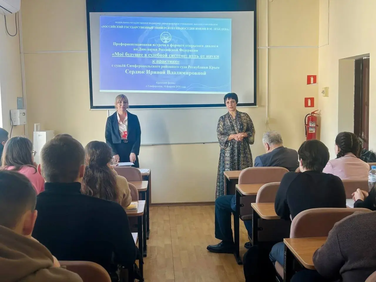 10 февраля 2026 года по случаю празнования официального государственного праздника «День российской науки» в Крымском филиале Университета правосудия им. В.М. Лебедева состоялась встреча студентов 4 курса с судьей Симферопольского районного суда Республики Крым Сердюк Ириной Владимировной, в ходе которой состоялся диалог на тему «Профессия судьи».
